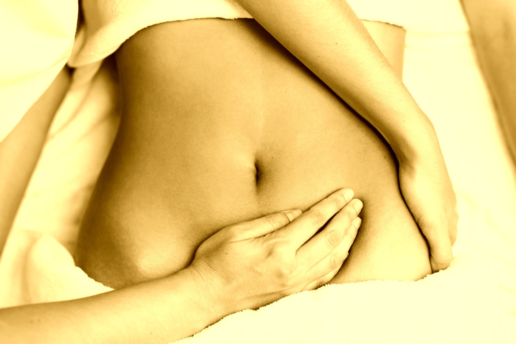 Top view of hands massaging female abdomen.Therapist applying pressure on belly. Woman receiving massage at spa salon