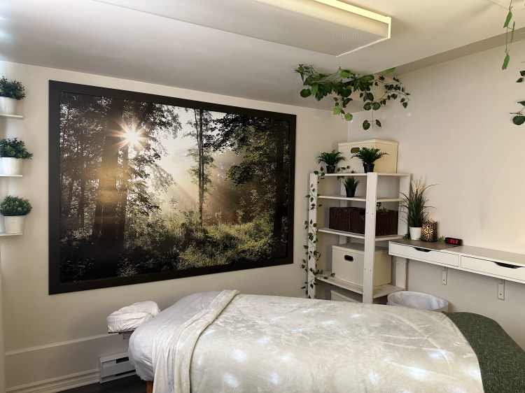 Meublé et décoré avec un fauteuil, table de massage et chaise zéro gravité selon le besoin, boîtes de rangement.