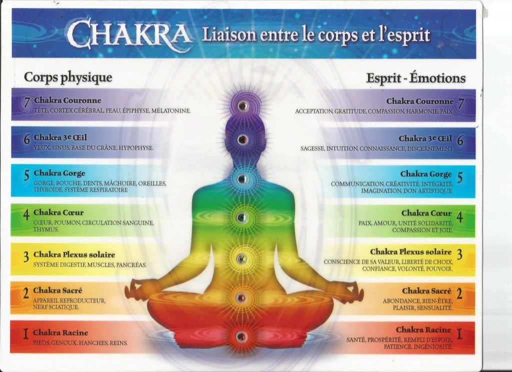 Les 7 chakras principaux sont également, du point de vue physiologique, des « carrefours » nerveux, vasculaires et hormonaux importants du corps où converge une multitude de substances chimiques essentielles au bon fonctionnement de ce dernier. L’activité de ces « carrefours » énergétiques agissent autant au niveau physique, psychique, émotionnel et spirituel.
